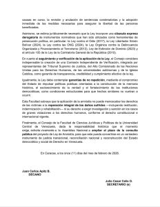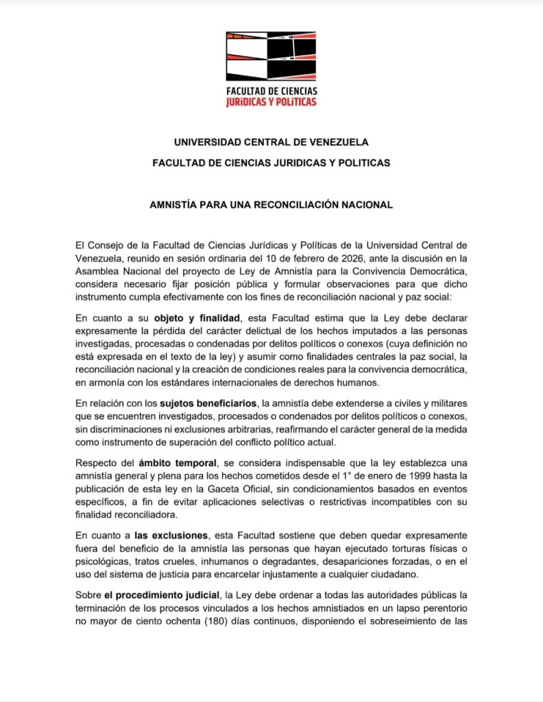 El Consejo de la Facultad de Ciencias Jurídicas y Políticas de la Universidad Central de Venezuela, reunido en sesión ordinaria del 10 de febrero de 2026, ante la discusión en la Asamblea Nacional del proyecto de Ley de Amnistía para la Convivencia Democrática, considera necesario fijar posición pública y formular observaciones para que dicho instrumento cumpla efectivamente con los fines de reconciliación nacional y paz social: