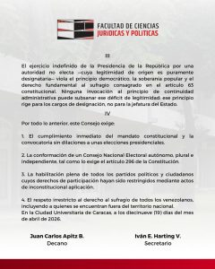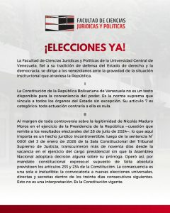 La Facultad de Ciencias Jurídicas y Políticas de la Universidad Central de Venezuela, fiel a su tradición de defensa del Estado de derecho y la democracia, se dirige a los venezolanos ante la gravedad de la situación institucional que atraviesa la República.